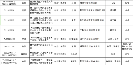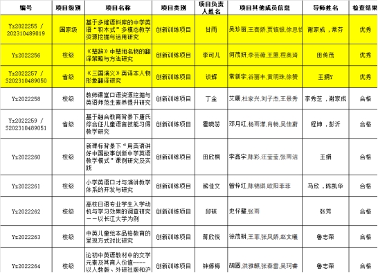 2024年外国语学院大学生创新创业训练计划项目需进行阶段检查的项目共19项,其中创新类项目13项,创业类项目6项;需进行结题验收的项目共18项,其中创新类项目14项,创业类项目4项。