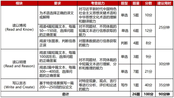 比赛形式为线上,赛题由大赛组委会提供,包括客观题若干道和议论文写作一篇。赛题涵盖习近平新时代中国特色社会主义思想核心内容,涉及经济建设、政治建设、文化建设、社会建设和生态文明建设等领域的重要话题,考查形式包括阅读、写作和翻译。部分赛题素材选自《习近平谈治国理政》第一卷、第二卷、第三卷、第四卷和党的二十大报告等。