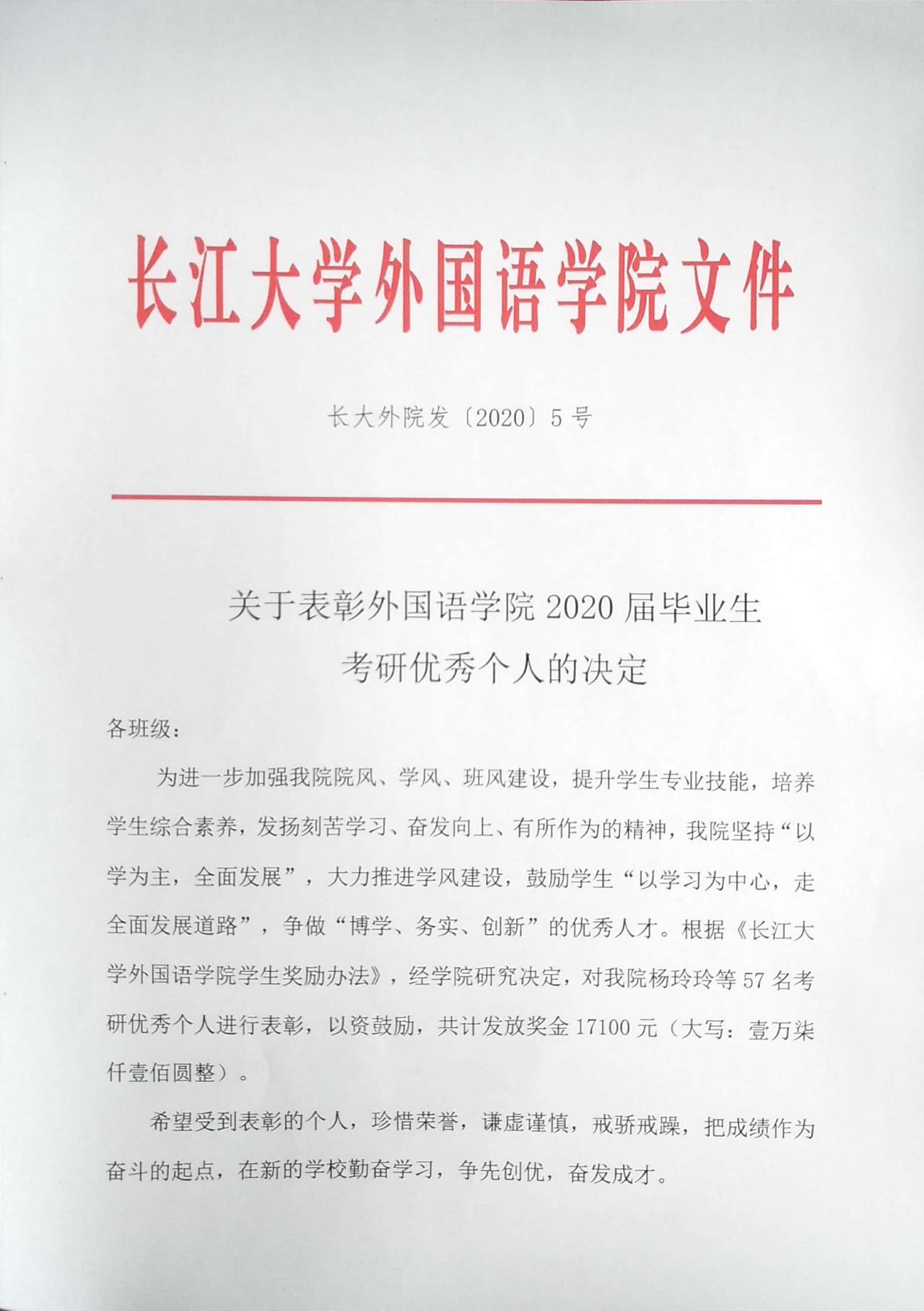 【考研表彰公示】关于表彰外国语学院2020届毕业生考研优秀个人的决定