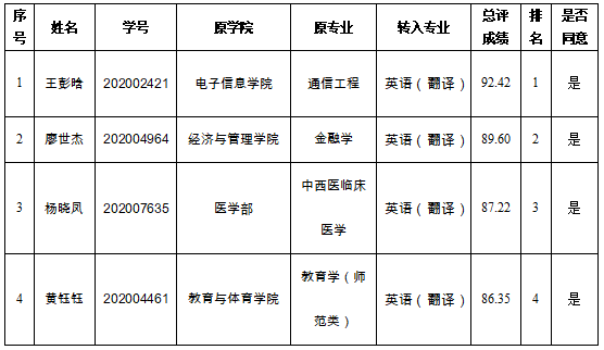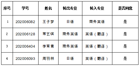 根据教务处《关于2020级普通本科生秋季学期转专业工作的通知》、《长江大学普通本科生专业分流与转专业管理办法(试行)》(长大校发[2019]260号)和《外国语学院2020级本科生秋季学期转专业考核工作方案》,经学生本人申请,资格审核,我院对学生进行了面试考察,现将外国语学院2020级本科生秋季学期转专业拟接收名单予以公示。公示时间:2021年9月8日 -2021年9月10日。公示期间如有疑问,请咨询外国语学院教学办公室,电话:0716-8060465,邮箱:302777702@qq.com。
