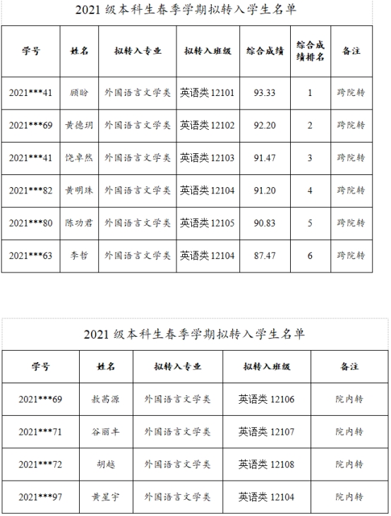 外国语学院2021级本科生春季学期转专业拟接收名单公示
