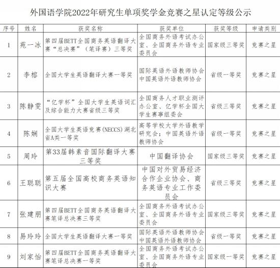 外国语学院2022年研究生单项奖学金竞赛之星等级公示
