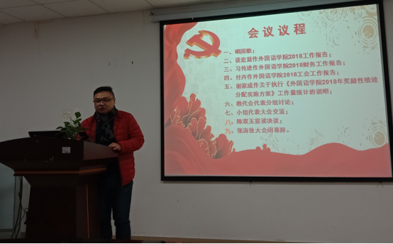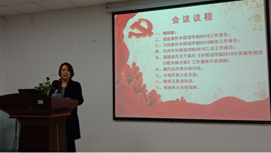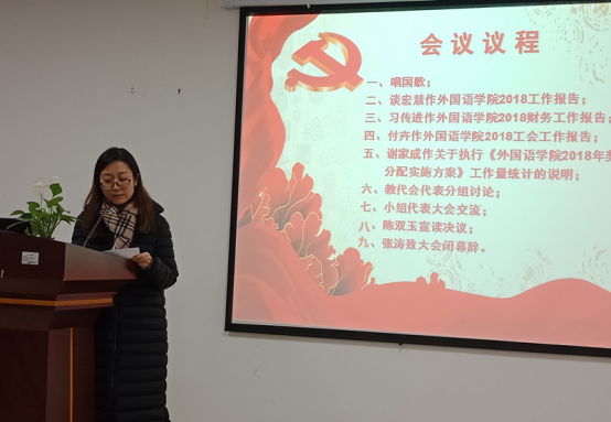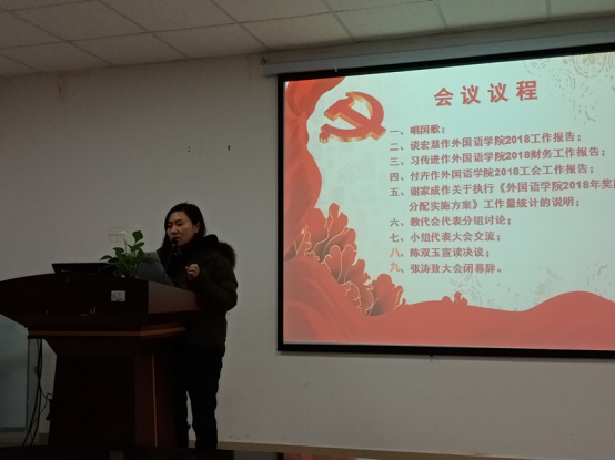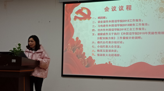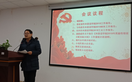 大会听取并审议了院长谈宏慧教授所作《外国语学院2018年工作报告》、党委书记习传进教授所作《外国语学院2018年财务工作报告》、工会副主席付卉《外国语学院2018年工会工作报告》和副院长谢家成教授所作《外国语学院2018年奖励性绩效分配实施方案》及工作量统计的说明。会议讨论并通过了《外国语学院2018年工作报告和财务工作报告》和《外国语学院2018年奖励性绩效分配实施方案》。