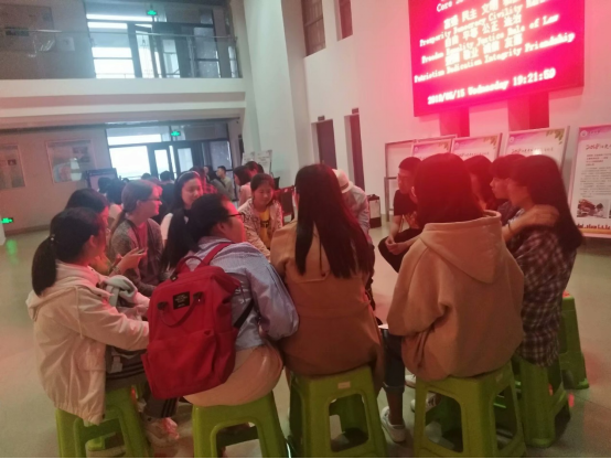 活动一开始,主持人跳了一简单的舞蹈,后主持人提出了第一个话题——中国文化中的各取所需,大家开始进行讨论。小编加入了外教Lazara所在的小组。刚开始大家都有点羞涩放不开,没有什么人说话,在外教Lazara的鼓励下,有一两个同学大胆的表达自己的想法。其中一个同学分享七夕节的由来,用英文流利的讲述了牛郎织女的故事,最后还补充道,“我们这些单身狗,没人一起过七夕节啊!”引得大家大笑不止。