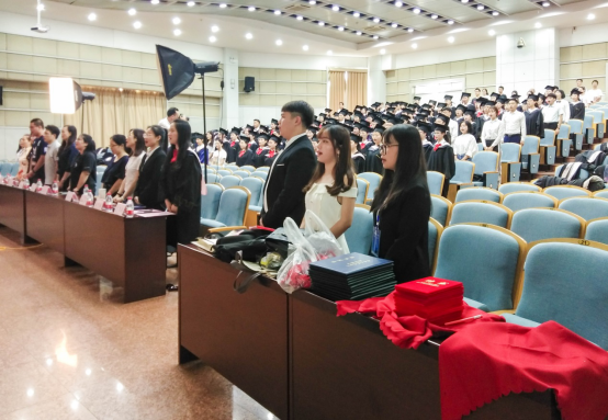 活动开始前,与会同学在老师的指导下,身穿学士服,头戴学士帽,郑重地为即将到来的活动准备着。在张涛书记的主持下,活动正式开始了首先,全体师生肃立,庄严奏唱国歌