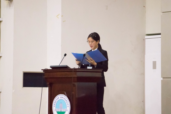 嘉宾发言完毕后,进行演辩社辩论表演赛《过程与结果何者重要》,大四辩论组和大二大三辩论组相互对抗,才子佳人,舌战群儒,八位辩手,各显神通。在场的师生听得聚精会神,时而掌声连连,时而捧腹大笑,十分有趣。辩论会结束后,高年级学生代表岳睿欣同学上台发言,她提出“经历挫败并从中学习,是成长的必经之路,而大学,就是需要你在挫败中反思,在问题中寻找方向。”大学生活已拉开帷幕,希望19届新生们能够珍惜当下,让青春不留遗憾,不负韶华,不负自己!