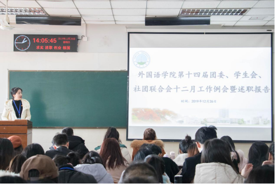 (摄/张芷艺 罗娜 文/ 谭皓洋 韩思洁)时光飞逝,又一个学期即将画上完美的句号。为推动我院学生会工作更长久地发展,提高干部们的工作热情和质量,12月26日下午14时,我院在12教404室举行了第十四届团委、学生会、社团联合会十二月工作例会暨述职报告,出席此次例会的有团委书记杜岳青老师、辅导员古力齐克热老师、学工办兼辅导员耿传令老师以及刘庸老师,全体学生会干部积极参与。第一团委副书记兼学生会主席李梓雯主持了本次大会。