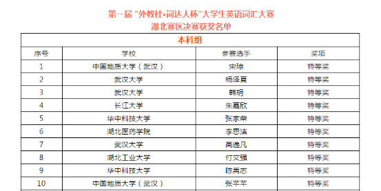 (通讯员:罗博)5月28日晚,第一届“外教社·词达人杯”大学生英语词汇大赛湖北省赛区决赛圆满落幕,我校共有20名非英语专业学生参加决赛,17名同学摘得奖项。法学院法学类31904班的朱嘉欣同学喜获本科组特等奖,3名同学获一等奖,8名同学获二等奖,5名同学获三等奖。我校获奖人数和质量居省属高校前列,长江大学荣获“优秀组织奖”,外国语学院李琼华老师被评为“优秀指导老师”。