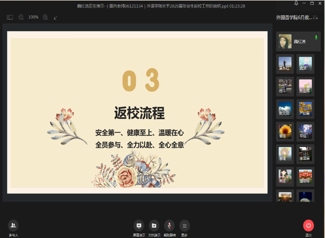党委副书记魏红洁向大家详细讲解了《外国语学院2020届毕业生返校工作方案》。据统计,自6月15日至30日,我院共有318名毕业生获得批准返校。为热情、周到、安全、有序做好我院毕业生返校相关工作,学院成立了毕业生返校办理毕业手续工作领导小组,由院党委书记和院长担任组长;制定了详细的毕业生返校流程,每一名毕业生返校都安排有联系人,联系人均由学院教师和学生志愿者担任。魏红洁副书记号召全院教职工积极主动参与到毕业生返校工作中来,让学生高兴而来,满意而归。