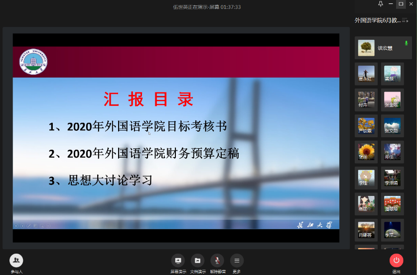 最后,院长谈宏慧向大家讲解了学院与学校签字的《2020年外国语学院目标考核书》主要考核指标情况;对学院2020年的财务预算进行了讲解和说明;对学校要求组织开展的“长江大学办学思想大讨论”进行了安排部署,6月21日前以系(部、室)为单位组织开展讨论,6月23日学院组织集中研讨交流,各系(部、室)选派代表进行交流发言。她希望全院教职工积极参与到办学思想的讨论中来,主动为学院“十四五”规划的制定建言献策,促进学院健康稳定发展。