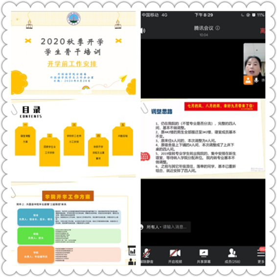 为进一步做好新学期的开学工作,加强我校学生骨干的工作能力,巩固假期疫情防控成果,828日晚上7点,我院通过腾讯会议线上召开了全体学生骨干培训大会。寝室长、层长、楼栋长、班长和团委学生会主要学生干部参加了会议。会议由学工办主任童超老师主持,团委书记许泽琼老师参加了会议。