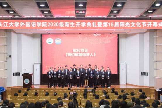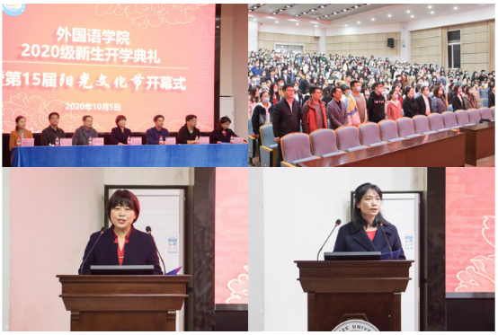 (摄/张芷艺 袁缘 文/韩思洁) 朗朗金秋,丹桂飘香。10月5日晚,外国语学院2020级新生开学典礼暨第十五届“阳光文化节”开幕式在12教405举行。外国语学院院长谈宏慧教授,党委书记危煜祥老师、副院长谢家成教授、副院长彭沂副教授、党委副书记魏红洁老师,学术委员会主席、博士生导师田传茂教授、教学委员会主席、英语系教师代表鲁志荣副教授,各系部主任、新生班主任老师、学工办辅导员老师出席典礼。我院448名全体新生参加了开学典礼,此次典礼由魏老师主持。