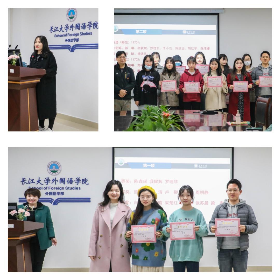 首先,蒋娟老师为外国语学院在师范技能竞赛获奖的十三位同学颁发奖项并与获奖同学合影纪念,鼓励大家不断提升自我。随后,副院长彭沂老师为今年外国语学院的优秀实习生颁奖,肯定了同学们在实习期间的优秀表现。紧接着,参加本次实习的杨晗、王仲璋、钟郡汝、李颖四名同学作为实习生代表分享了各自的实习故事,讲述了实习时的心得体会,分享了自己的实习收获,同时也反思了实习过程中自身的不足。