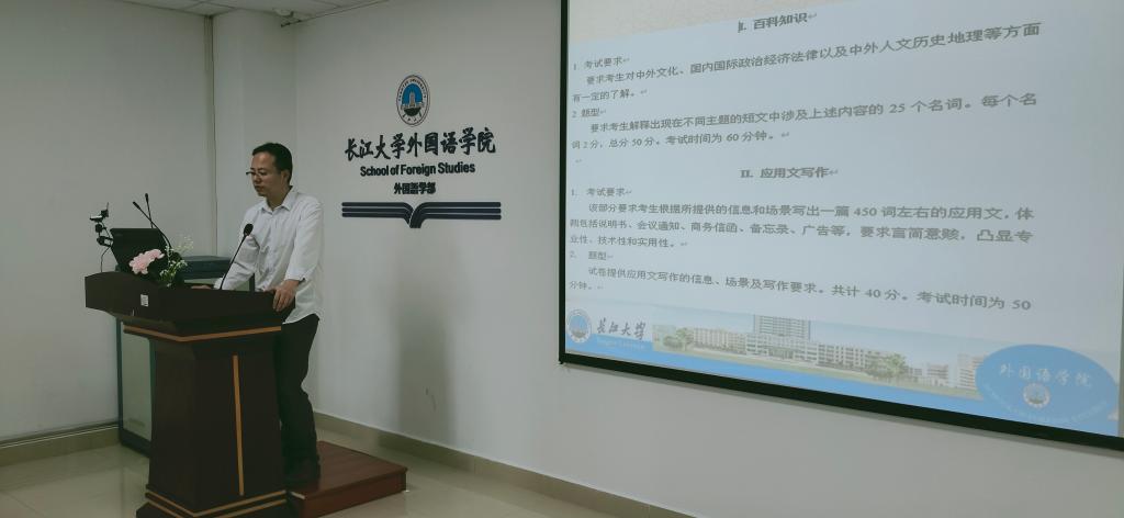 付小秋副院长以“为什么要考研”的问题切入主题,告诉同学们选择比努力重要的道理,欢迎大家积极报考长江大学。谢家成副院长介绍了学院近五年来博鱼网页版和外国语言学及应用语言学、翻译硕士(英语笔译)和教育硕士(学科英语)等学位点,不仅仔细介绍了各学位点具体方向,各自课程特色,还从研究生培养及资助体系方面详细为营员们答疑解惑。导师代表田传茂教授则为同学分析了研究生的培养流程,从如何选导师、如何选择适合自己的课程及如何发表文章等方面向营员们分享了自己的研究生培养经验,鼓励同学们通过参加学术会议、国外游学、参加学科竞赛、参与社会服务以及参与科研项目等多方面开阔学术视野,田教授的介绍就是一部考研指南。王峰教授主要介绍了我院MTI的发展以及培养情况,鼓励大家积极了解研究生考试要点、熟悉考试真题,欢迎大家积极报考长江大学。