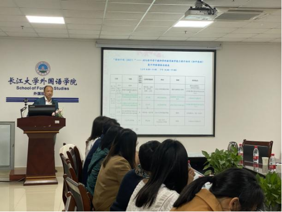 10月8日晚,长江大学“国培计划(2021)——初中英语青年骨干教师学科教育教学能力提升培训项目”开班仪式在文科大楼712会议室举行。外国语学院副院长谢家成教授,班主任吴亚华、李秀芝华老师以及来自省内各地99名初中英语教师参加了开班仪式。