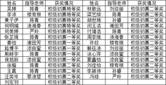 本次大赛,我校共有27名同学分获校级初赛特等奖、一等奖和二等奖。获奖学生名单和指导老师名单如下:
