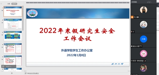 1月8日晚,外国语学院通过线上形式召开全体研究生寒假安全教育大会。外国语学院党委副书记程坤、全体研究生参会,大会由兼职辅导员方大鹏主持。