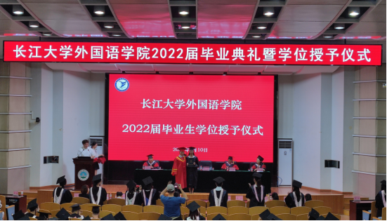 为给毕业生留下青春记忆,定格美好瞬间,6月10日上午,外国语学院在12教405举行2022届毕业典礼暨学位授予仪式,学院师生在毕业生纪念视频中重温曾经的难忘时光,院领导为优秀毕业生颁发荣誉证书,院长谈宏慧教授向毕业生们表示热烈祝贺并寄语全体毕业生:要立志明德修身、求善求美;要立志终身学习、求知求真;要立志报效祖国、服务人民。毕业生代表李淑婷在发言中将四年的学习感悟总结为“怀揣一份对生活的热爱,牢记青春一代的理想”。在激昂的进行曲中,院长谈宏慧为毕业生们一一扶正流苏、授予学位,并合影留念。杜岳青老师倾情演唱《这世界那么多人》,更是将四年回忆融入到歌声之中,将毕业典礼推向了高潮,在依依惜别和美好祝愿中落下帷幕。