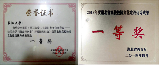 在阳光文化的熏陶下,先进集体和个人不断涌现,英语10505班荣获“湖北省优秀班集体”荣誉称号,郭红雁、王思诗、王斌分别被评为“崇德守信好青年”“湖北省三好学生”和“湖北省优秀大学生”,刘亚婧等28人入选长江大学“万人创百星”,一批学生被评为“优秀共产党员”、“十佳诚信个人”。