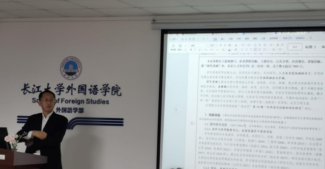 (通讯员 邓姝曼)为切实做好2024年国家社科基金申报工作,提升学院教师基金申请书申报质量,12月11日上午,广东外语外贸大学博士生导师黄忠廉教授在我院文科楼712室作了题为“国社科项目申报及案例帮评”的专题报告。外国语学院院长谈宏慧、分管科研工作副院长谢家成、国家社科基金项目申报教师等20余人参加了会议。会议由谈宏慧主持。