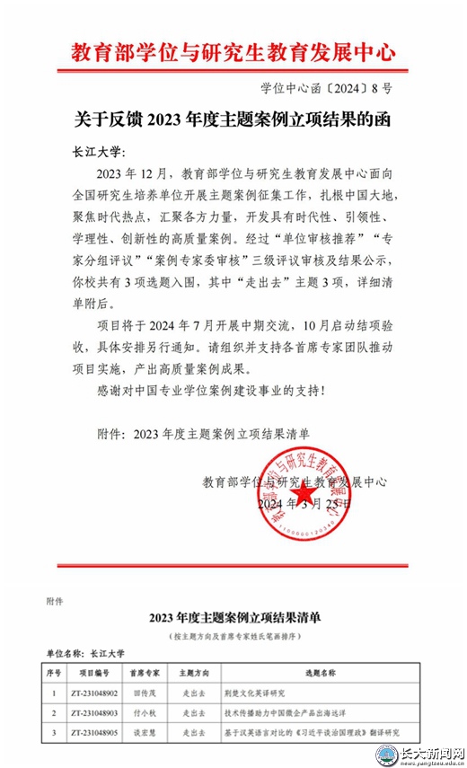 本次获批的3项主题案例分别是谈宏慧教授担任首席专家的《基于汉英语言对比的〈习近平谈治国理政〉翻译研究》、田传茂教授担任首席专家的《荆楚文化英译研究》、付小秋博士担任首席专家的《技术传播助力中国微企产品出海远洋》。三位老师积极响应教育部学位与研究生教育发展中心征集主题案例的核心目标,结合外国语学院翻译硕士人才培养的实际需求和教学经验,围绕“走出去”主题,聚焦中国“产品走出去”“教育走出去”“文化走出去”的问题,总结中国经验、讲好中国故事,为建构中国自主知识体系提供案例视角,获得了教育部专家评委的一致认可。