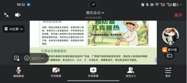 在健康管理方面,班级负责人向同学们传达当前“两热”防控形势,布置返校前后健康摸排工作,同时介绍“美丽长大——我们在行动”、“文明宿舍创建”等第二课堂活动内容,引导学生做好宿舍卫生与健康防护。