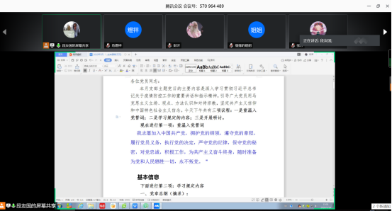 为了进一步贯彻落实中央关于统筹推进疫情防控和经济社会发展的决策部署,5月14日下午,学院教工各党支部利用“腾讯会议”在线上开展了“支部主题党日”活动。活动分别由各教工党支部书记主持,支部全体党员共同参加,支部所辖系部室非党员教职工列席会议。