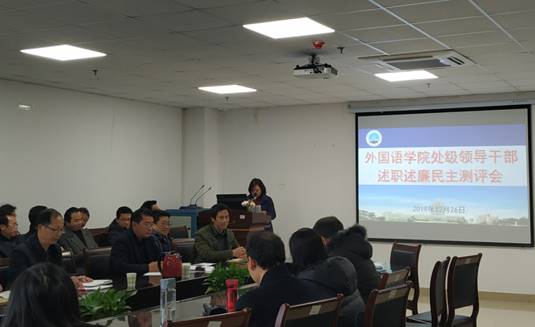 12月26日下午,我院处级领导干部述职述廉民主测评会在文科楼712会议室召开。由校机关及直属单位党委书记陈平忠、校党委宣传部科长汤慧珍组成的学校考核组参加了会议,会议由陈平忠书记主持。测评会后,院党委书记危煜祥主持召开了主题教育总结会和十九届四中全会精神宣讲会。