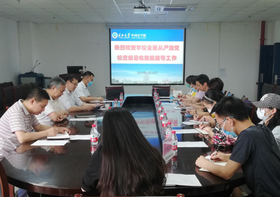 5月28日下午,以校党委常委、副校长张大平为组长,校工会常务副主席王勇、校团委副书记秦良斌、学校办公室科长陆峰为组员的校党委全面从严治党第七检查组莅临外国语学院,对学院2019年以来全面从严治党工作进行了检查指导。
