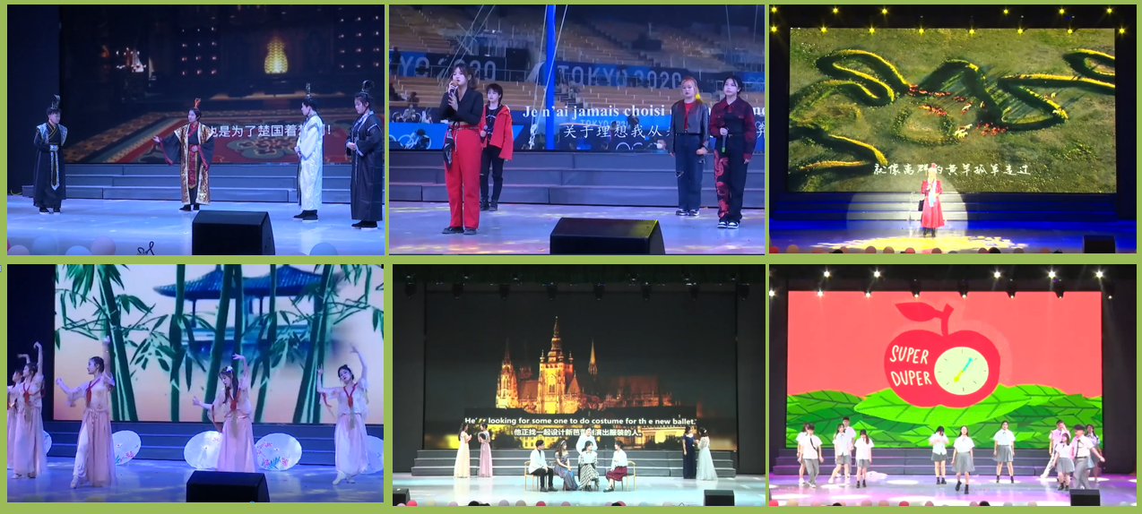 闭幕式文艺汇演在精彩的舞蹈中开场。分为“盛世华章,继往开来,初心难忘谱新曲”“激扬青春,强国有我,英姿奋发正当时”两个篇章。整台晚会彰显特色、突出专业、精彩纷呈,线上观众热情高涨。汉语、英语、日语、俄语、法语5个语种演唱的歌曲《追梦赤子心》,带领观众领略不同语言的魅力;笛萧合奏《无羁》,古风古韵,回味无穷;外文剧团呈现的经典剧作《Midnight in Poris(午夜巴黎)》,地道的英语、绅士且高雅的表演、华丽的场景深深打动着观众们的心;日语配音节目《辉夜姬大小姐》、教师韩艳丽博士倾情演唱的蒙语歌曲《忘不了》等节目全面展示了不同语言的文化底蕴与特色……外国语学院师生用丰富的艺术形式展现多彩校园文化生活。颁奖晚会在合唱《光荣啊,中国共青团》中圆满落幕。