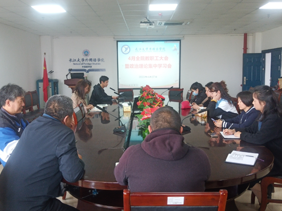 4月27日下午,外国语学院在文科楼712会议室召开4月全院教职工大会暨政治理论集中学习会。会议采用线上线下相结合的方式进行,学院全体教职工参加了此次会议。