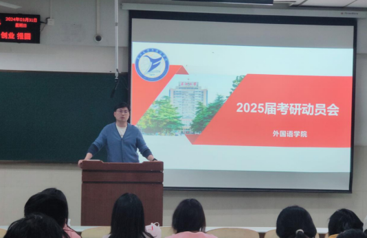 (通讯员 马天雨)为努力攻坚“8535”目标,超前谋划2025届学生考研工作,加强对备考学生的全周期指导,外国语学院在前期收集分析整理了2025届考研意向信息后,于3月31日晚在12教302召开了2025届考研动员会。学院党委副书记程坤、副院长付小秋、学工办主任童超参加动员会,会议由年级辅导员马天雨主持。
