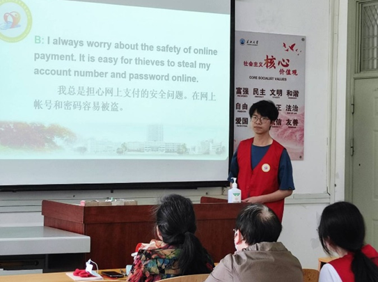本次教学以“网络支付安全”为主题,主讲人从单词开始教学,依次带读短语、对话。其余志愿者分散坐在老人身边,进行一对一辅导,与他们一起朗读单词句子并纠正老人单词读音。