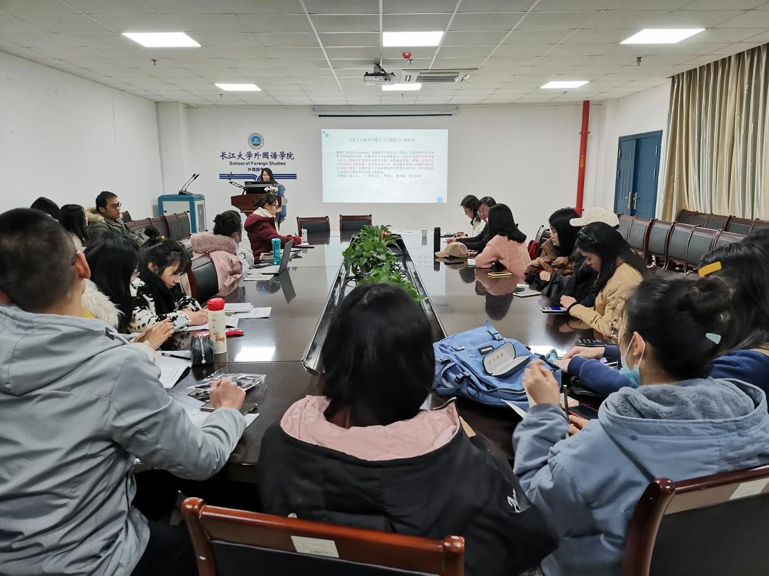 (通讯员/邓爽)2020年11月26日晚上7点,外国语学院研究生在文科大楼712举行了第22期读书报告会,本次读书报告会的主讲人是方佳与傅琴,两位主讲人均由侯艳芳副教授指导。