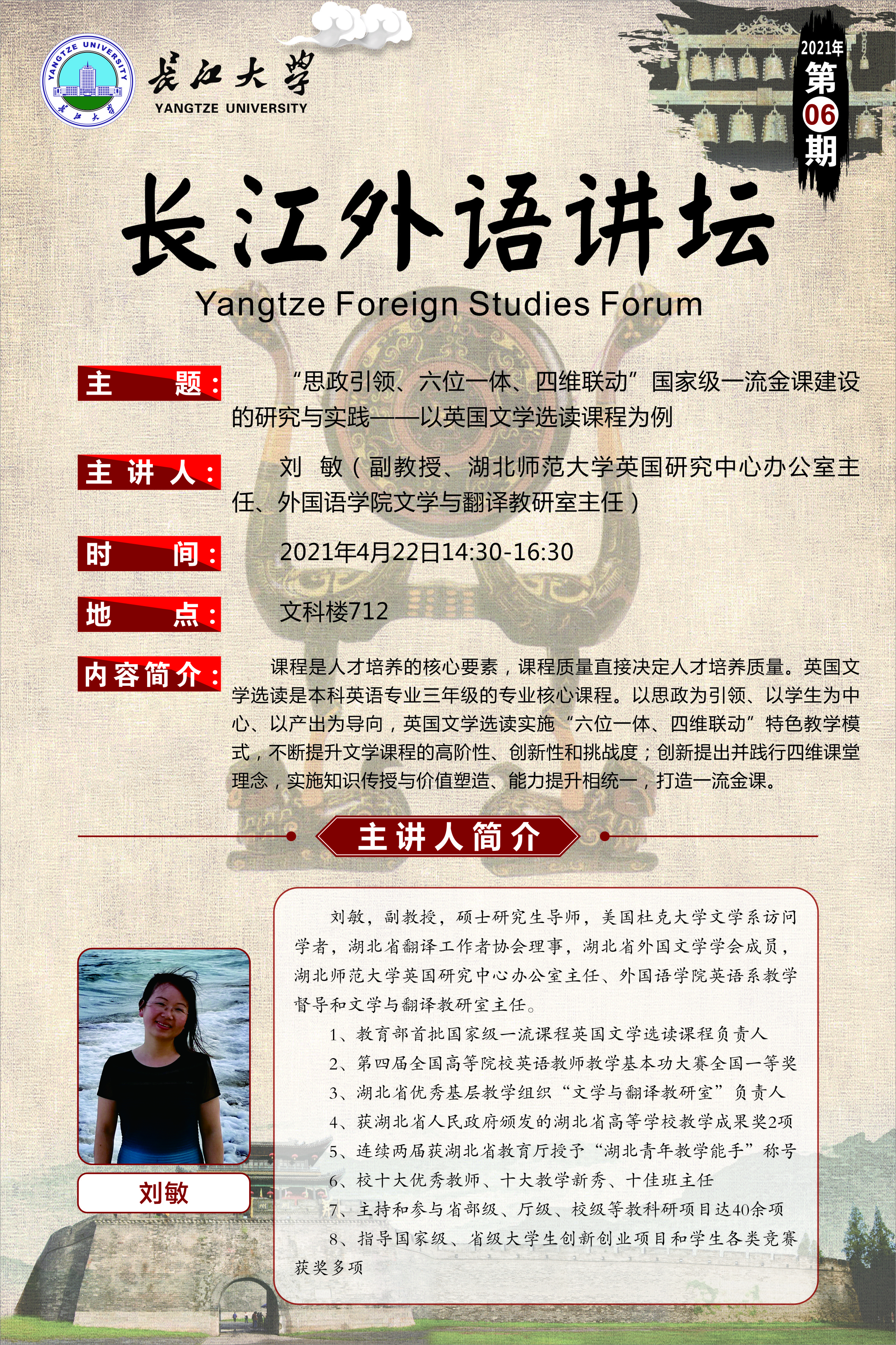 长江外语讲坛(2021年第六讲):“思政引领、六位一体、四维联动”国家级一流金课建设的研究与实践——以英国文学选读课程为例