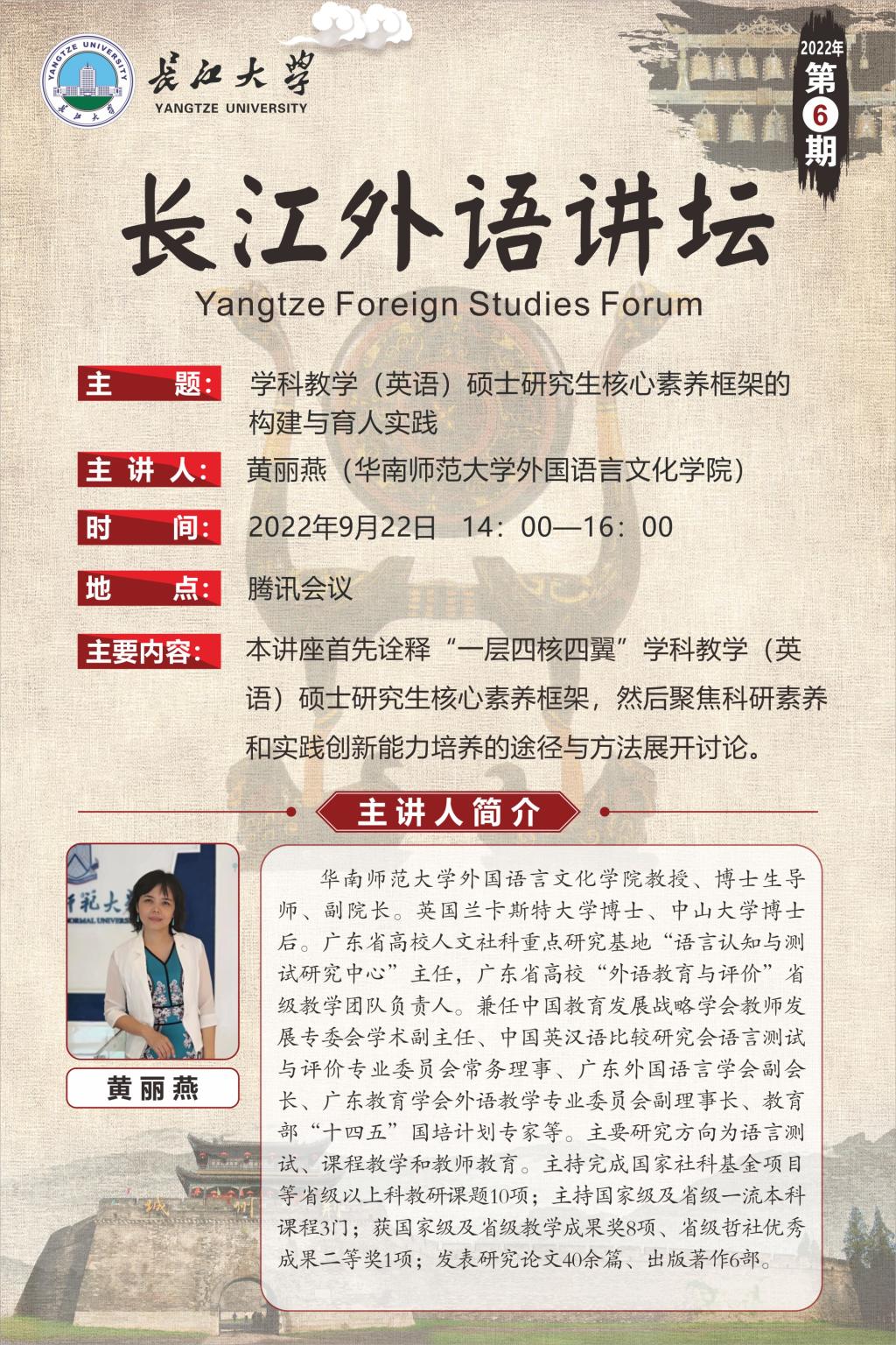 长江外语讲坛(2022年第六讲)学科教学(英语)硕士研究生核心素养框架的构建与育人实践