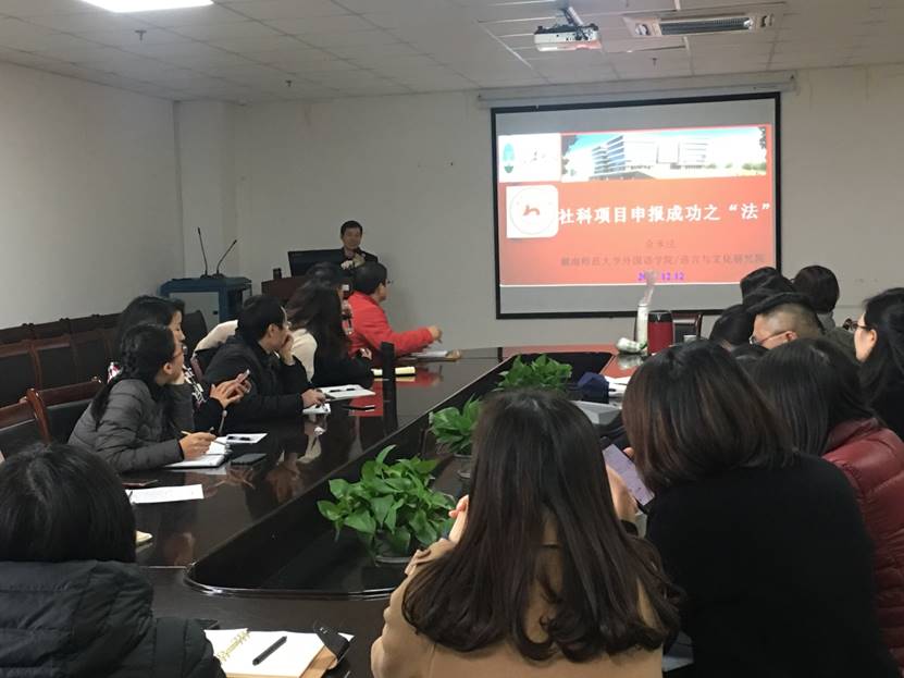 (文/刘小恋)2019年12月12日星期四下午14:10-16:10,博鱼网页版在文科楼712会议室成功举办了社科项目申报成功之“法”》的学术讲座,主讲人为湖南师范大学“潇湘学者”特聘教授、博士生导师和博士后协作导师余承法教授。讲座由外国语学院副院长谢家成主持,我院众多教师及研究生聆听了讲座。