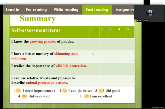 接着,刘佳意同学带来了他的教学设计展示。刘佳意同学的课堂结构清晰,环节设计巧妙,通过层层递进的任务安排,帮助学生在循序渐进中掌握了所学内容。同时,他在教学设计中注重与学生的互动,引导学生参与讨论,通过提问激发学生思考,鼓励他们表达自己的想法,在教学环节中融入多模态教学材料,并将教学评一体化的教育理念落到实处。